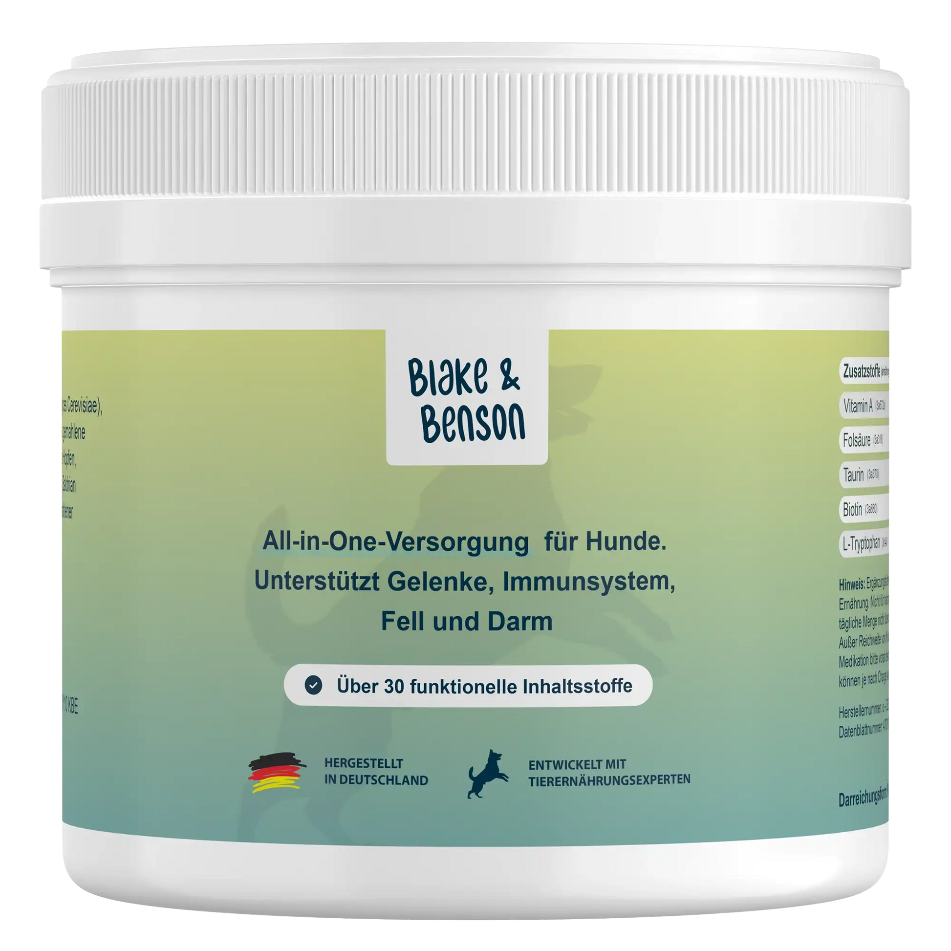 Blake & Benson Daily+ für Hunde ist ein hochwertiges All-in-One Ergänzungsprodukt – entwickelt, um die tägliche Versorgung mit wichtigen Vitalstoffen einfach, sicher und wirkungsvoll zu machen.