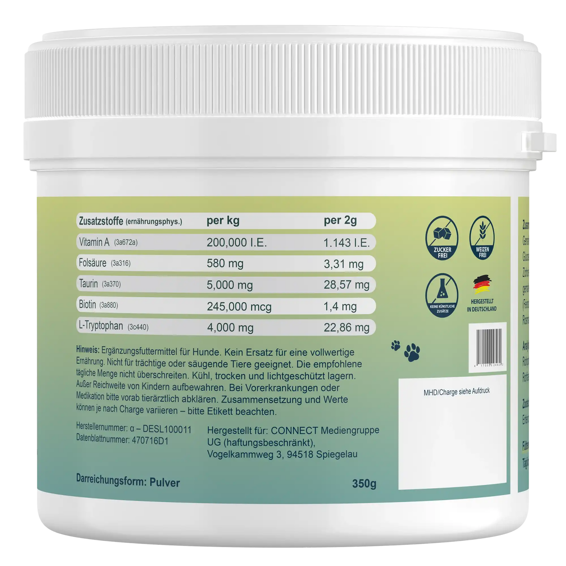 Biotin, Spirulina, Bierhefe und pflanzliche Vitalstoffe fördern ein glänzendes Fell, eine gesunde Hautbarriere und können Juckreiz oder Hautirritationen reduzieren – für sichtbares Wohlbefinden.