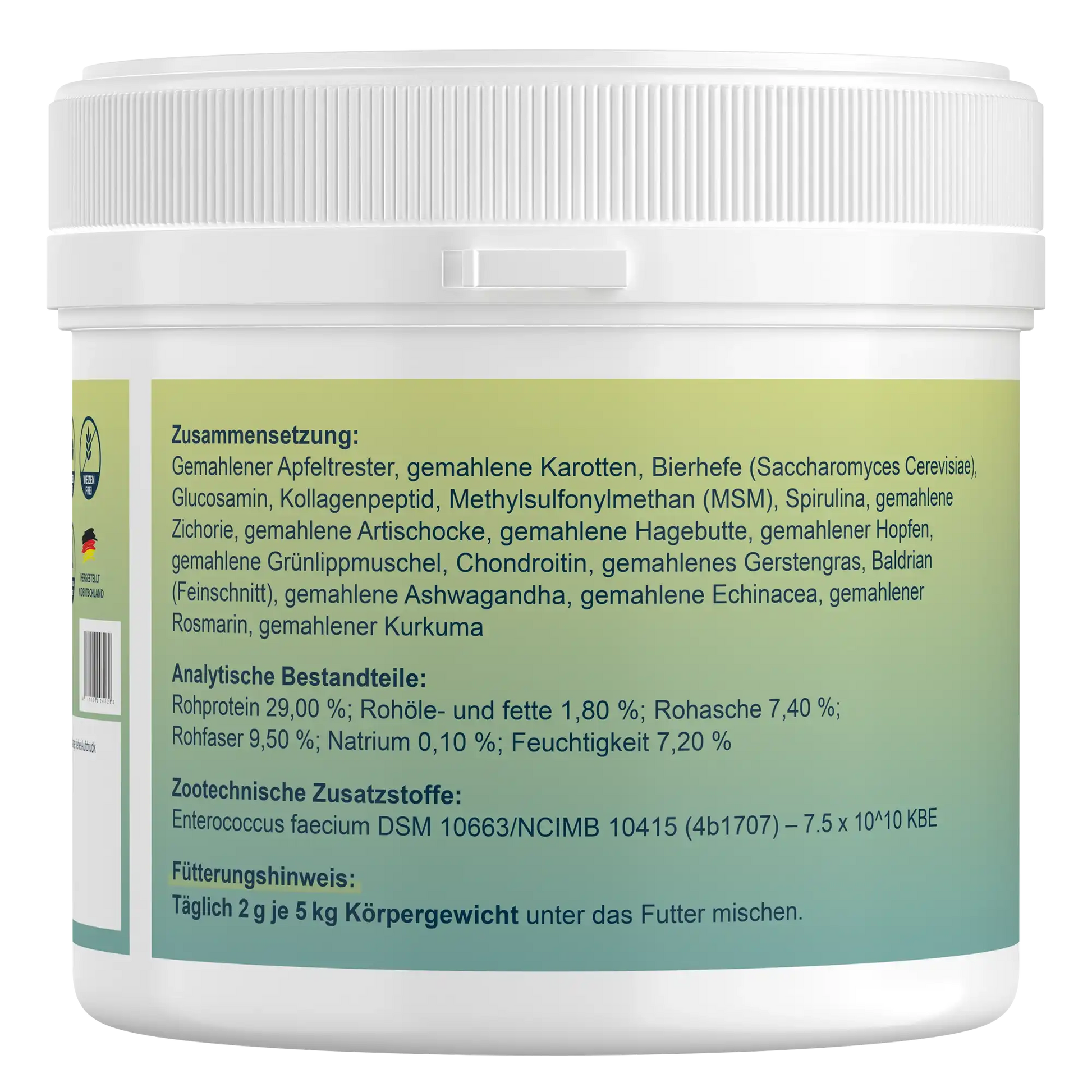 Die Rezeptur enthält über 30 funktionelle Inhaltsstoffe – darunter Vitamine, Gelenkbausteine wie Glucosamin und Chondroitin, Superfoods, Kräuter, Probiotika und Aminosäuren – in einer aufeinander abgestimmten Kombination.